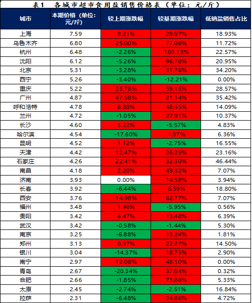 分城市来看,2023年5月,上海、乌鲁木齐、重庆、广州、呼和浩特、长沙、昆明、天津、石家庄、南昌、西安、福州、贵阳、郑州、南宁超市销售食用盐均价较2023年4月上涨;济南超市销售食用盐均价较2023年4月持平;杭州、沈阳、北京、西宁、兰州、哈尔滨、长春、武汉、南京、银川、青岛、合肥、太原、拉萨超市销售食用盐均价较2023年4月下跌。