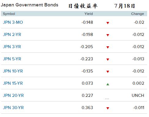 一级市场,日本财务省上午招标的1年期贴现国债实际发行1.55万亿日元,投标倍数4.57倍,市场需求较旺盛,平均价格收益率-0.1971%。财务省当日还公告称,拟于7月25日发行2万亿日元2年期国债。