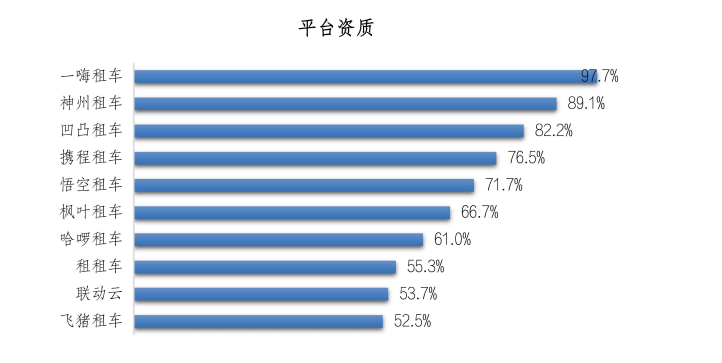 在NPS净推荐值中71.4%的受访者在推荐原因中选择“平台资质”。其中,一嗨租车的推荐者选择该原因的比例最高,占比为97.7%;其次是神州租车,为89.1%;排名第三的是凹凸租车,为82.2%。