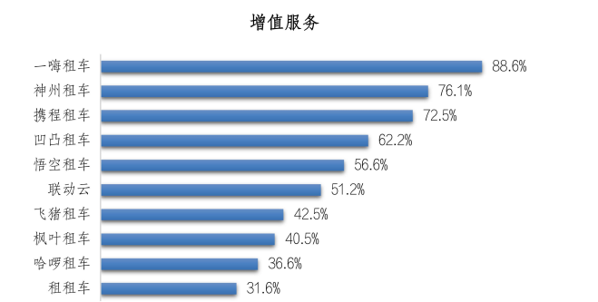 同时,56.9%的受访者在推荐原因中选择“增值服务”。一嗨租车的推荐者选择该原因的比例最高,为88.6%;其次是神州租车,为76.1%;第三的是携程租车,为72.5%。儿童安全座椅、紧急救援服务、不计免赔服务、GPS导航服务是衡量的标准。
