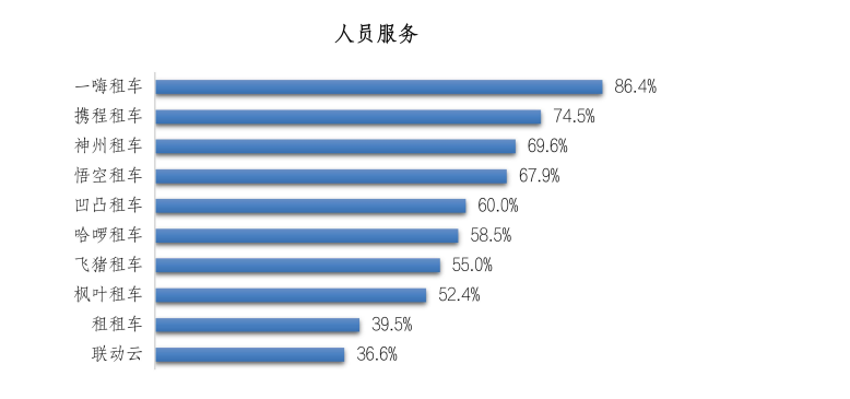 其次,61.0%的受访者在推荐原因中选择“人员服务”。一嗨租车被推荐原因占比最高为86.4%;其次是携程租车和神州租车,分别为74.5%和69.6%。受访者认为送、取车人员服务态度好,守时,专业是他们考量的标准。