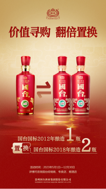 此外,为进一步彰显年份的稀缺价值,国台将开启国台国标真实年份酒“价值寻购·翻倍置换”活动,一瓶国台国标(2012年酿造)可置换两瓶国台国标(2018年酿造),置换时间为2023年5月1日至2023年12月30日,全国所有区域的消费者、经销商均可参加。同时,国台老酒平台公司即日起面向市场寻购国台国标2013年酿造、2014年酿造、2015年酿造、2016年酿造四款产品。