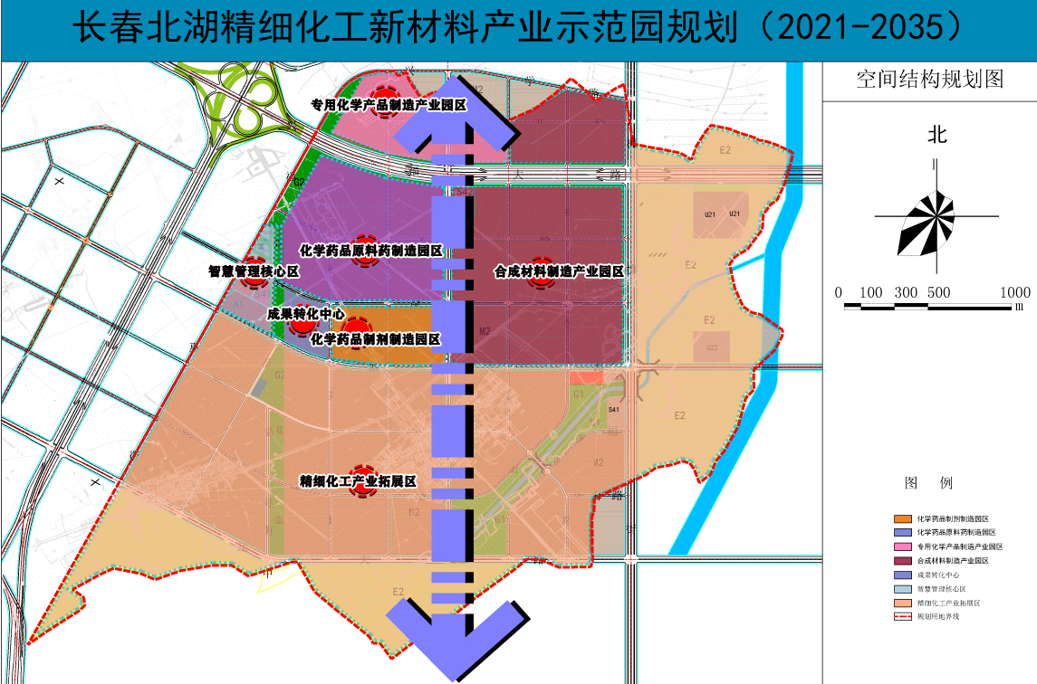 长春北湖精细化工新材料产业示范园地处长春新区战略新兴产业发展的核心腹地。总投资约178亿元,总规划面积9平方公里,其中,一期3.698平方公里,二期5.302平方公里为预留扩展区。规划“一轴两心四区”的产业空间发展布局。“一轴”即以福昌大街为轴,打造产业发展主轴;“两心”即打造智慧管理核心和成果转化核心;“四区”即打造化学药品原料药制造产业区、化学药品制剂制造产业区、专用化学品制造产业区、合成材料制造产业区等四大功能区。
