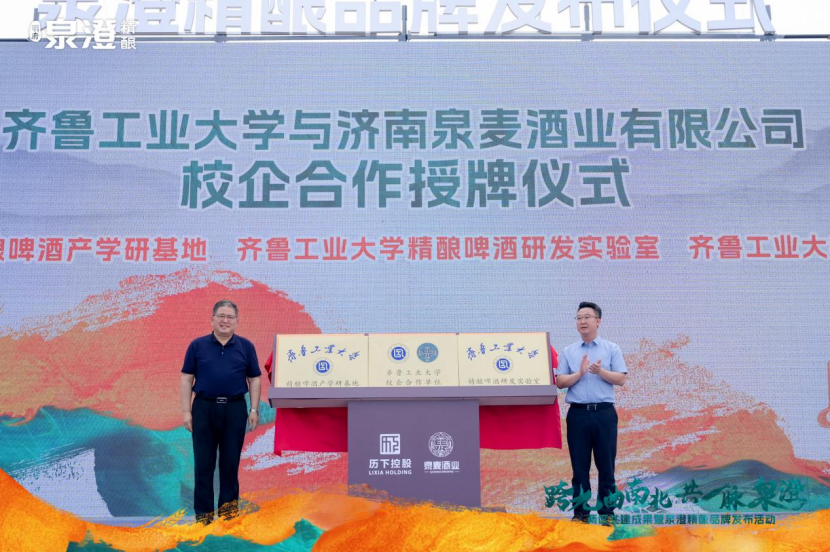 发布仪式现场,泉澄精酿品牌首次推出了纯麦拉格啤酒、德式小麦啤酒、比利时小麦啤酒、经典IPA啤酒四款风味各异的特色精酿啤酒。齐鲁工业大学副校长吴衍涛为项目授予“齐鲁工业大学精酿啤酒产学研基地”“齐鲁工业大学精酿啤酒研发实验室”和“齐鲁工业大学校企合作单位”三块牌匾,并表示将全力支持济南泉麦酒业打响泉澄精酿品牌。