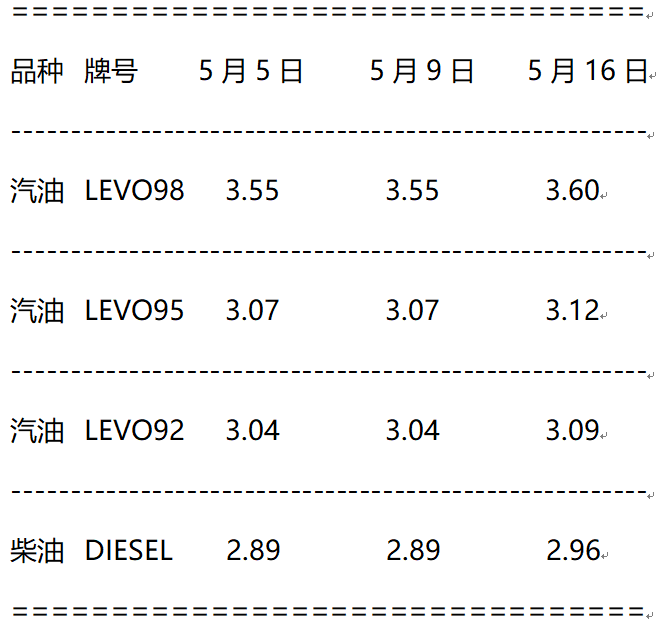 5月16日新加坡汽、柴油零售价格较前一周上涨。最近一次价格调整日期为2022年5月9日。