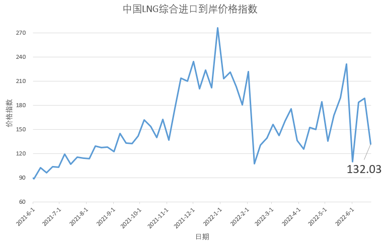 海关总署全球贸易监测分析中心和上海石油天然气交易中心联合发布的中国LNG综合进口到岸价格指数显示,6月13日-19日中国LNG综合进口到岸价格指数为132.03,环比下降30.03%,同比上涨29.80%。