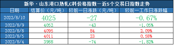 新华财经·指数|山东港口大商中心钢坯、热轧C料价格指数日报(8月10日)