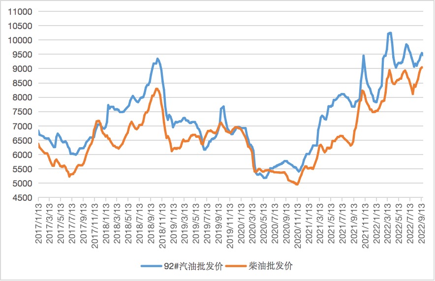 图表:中国汽柴油批发价格指数周度均价走势图(单位:元/吨)