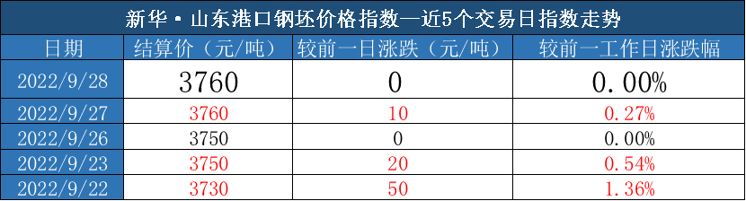 新华财经北京9月28日电(吕世阔) 截至2022年9月28日,新华·山东港口钢坯价格指数报3760元/吨,较前一交易日持平。