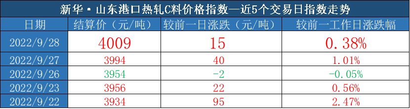 截至2022年9月28日,新华·山东港口热轧C料价格指数报4009元/吨,较前一交易日上涨15元/吨,涨幅0.38%。