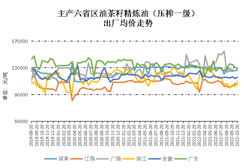 数据显示,10月上半月,全国重点省区油茶生产加工企业油茶籽精炼油(压榨一级)出厂均价较9月下半月多呈现上行趋势。其中,浙江、安徽两省重点企业油茶籽精炼油(压榨一级)出厂均价较9月下半月涨势明显,涨幅分别为8.21%和1.53%;湖南、广西两省区重点企业油茶籽精炼油(压榨一级)出厂均价较9月下半月分别微幅上涨0.79%和0.24%。江西、广东两省重点企业油茶籽精炼油(压榨一级)出厂均价较9月下半月分别小幅下跌1.42%和1.21%。