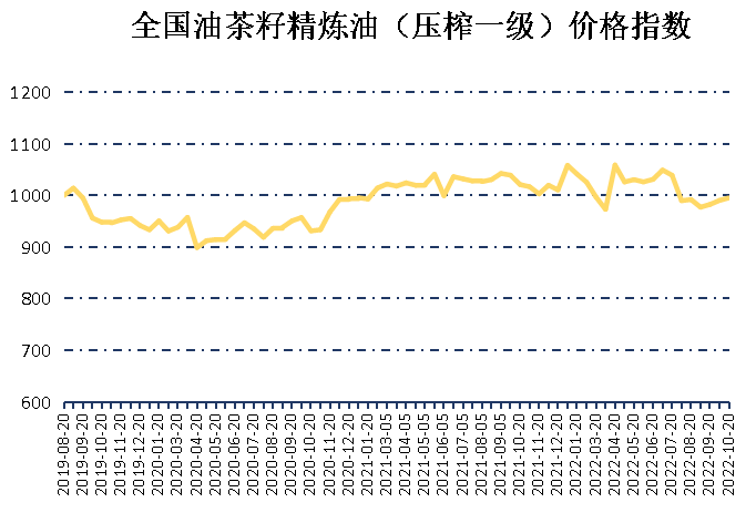 截至10月20日,全国油茶籽精炼油(压榨一级)价格指数报995.57点,较9月下半月990.60点上涨4.97点,涨幅0.50%,指数微幅上涨;指数较基期下跌4.43点,跌幅0.44%。