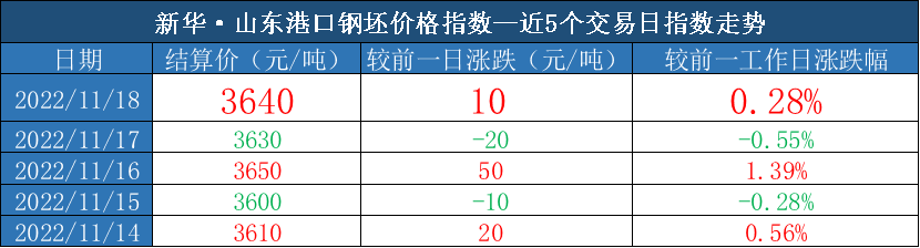 新华财经北京11月18日电(吕世阔)截至2022年11月18日,新华·山东港口钢坯价格指数报3640元/吨,较前一交易日上涨10元/吨,涨幅0.28%。