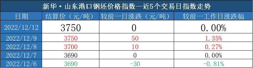 新华财经北京12月12日电(吕世阔)截至2022年12月12日,新华·山东港口钢坯价格指数报3750元/吨,较前一交易日持平。