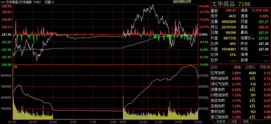 截至下午收盘,追踪国内商品市场的综合指数收报228.27点,较前一交易日上涨0.37点,涨幅0.16%。全天商品市场累计净流入资金5.02亿元。