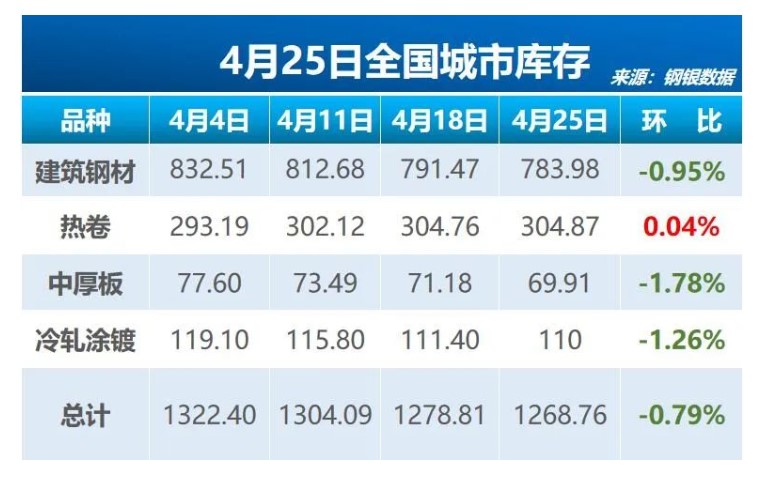 钢银电商25日公布数据显示,截至4月25日当周,全国39个城市,共计142个仓库的城市钢铁总库存量为为1268.76万吨,环比减少10.05万吨,降幅0.79%。