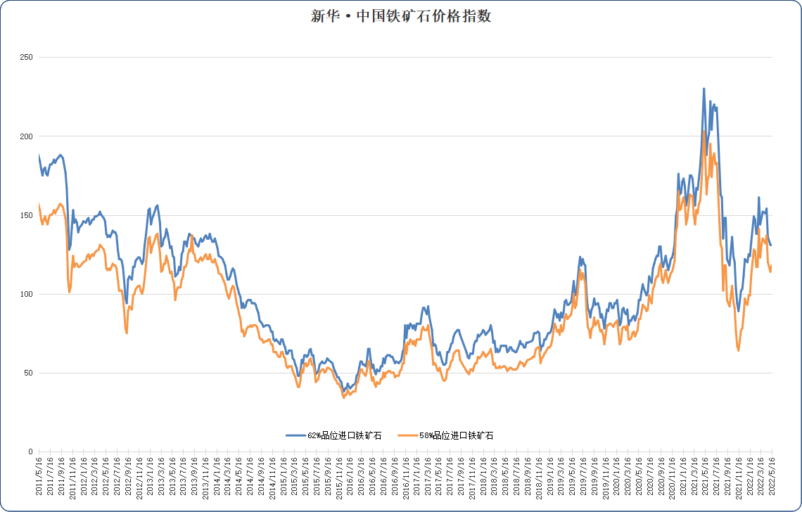 新华·中国铁矿石价格指数显示,5月10日至5月16日间,进口铁矿石价格稳中偏弱运行。