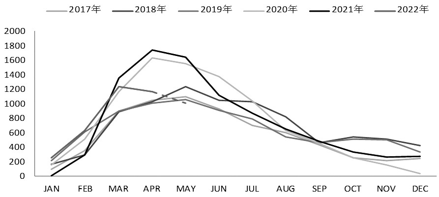 截至4月底,2021/2022年度美豆已完成USDA此前设定的出口预期。该阶段过去5年周均销量为23万吨,最低值为6万吨。但4月中旬以后美豆相对巴西大豆出口优势走弱,出口节奏放缓。据USDA出口销售数据,截至5月5日当周,2021/2022年度美豆出口净销售为14.4万吨,处于预估区间低端,前一周为73.5万吨;2022/2023年度美豆净销售7.7万吨,前一周为40.7万吨。因此我们将4—8月美豆周均出口量以15万吨的中间值来做预估,未来18周美豆旧作出口量或有270万吨,约1亿蒲式耳待出口。2021/2022年度美豆总计出口量或达甚至超过22亿蒲式耳,即后期2021/2022年度美豆出口仍有调增空间,继续消耗美豆旧作库存。