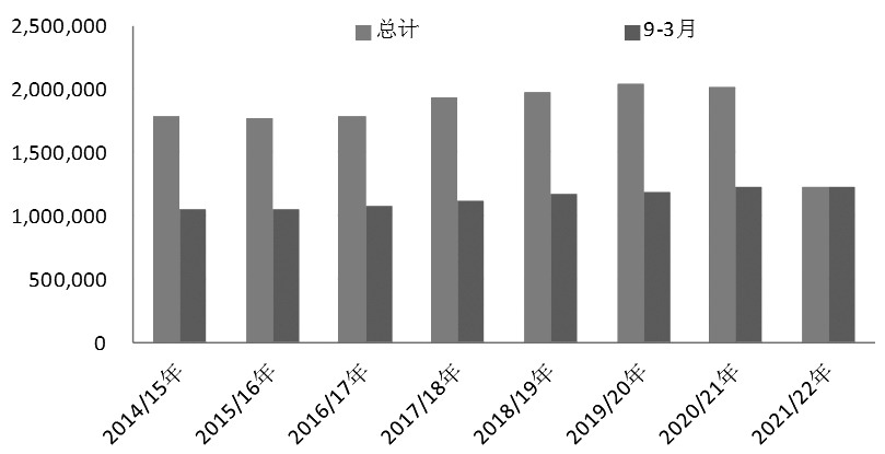 受美国高榨利驱动,近两年美豆压榨需求同样旺盛。1—3月,美国共压榨大豆5.29亿蒲式耳,刷新同期历史高值,同比增加1124万蒲式耳,增幅2.17%,高于5年均值4.97亿蒲式耳。从市场年度看,2021年9月至今年3月,美豆共计压榨量12.33亿蒲式耳,创历史同期最高水平,同比小幅增加402万蒲式耳。按USDA在5月报告中22.15亿蒲式耳的预估计算,2022年4—8月美豆压榨量需要8.4亿蒲式耳就可以完成年度目标,基本与2019/2020年度同期创纪录的8.5亿蒲式耳持平。