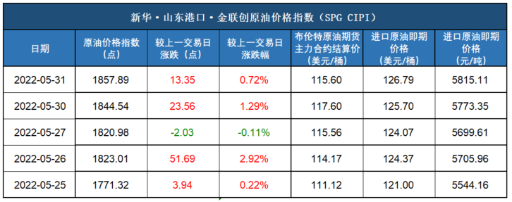 新华财经北京6月1日电(杨猛) 截至2022年5月31日,新华·山东港口·金联创原油价格指数(SPG CIPI)报1857.89点,较前一交易日上涨13.35点,涨幅0.72%;进口原油即期价格为126.79美元/桶,合人民币5815.11元/吨。山东港口进口原油综合到岸贴水估价为1.71美元/桶,较前一交易日持平。