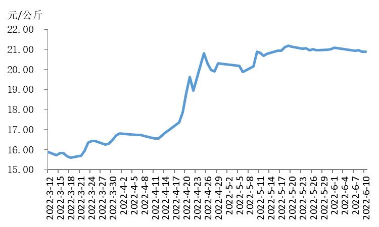 截至6月10日当周,16省(直辖市)瘦肉型白条猪肉出厂价格总指数的周平均值为每公斤20.93元,环比微跌0.5%,同比由前一周下跌5.3%转为上涨1.3%,是自2020年10月以来同比首次由负转正。