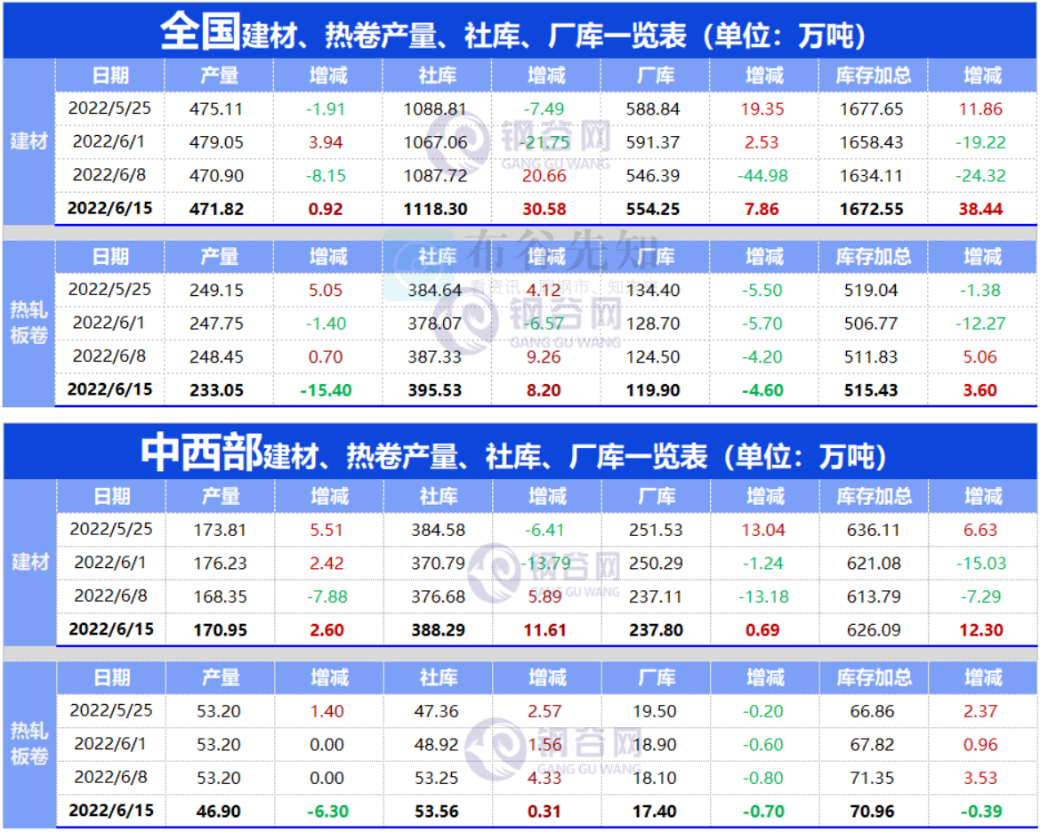 截至6月15日当周,中西部建材社库388.29万吨,较上周增加11.61万吨,上升3.08%;厂库237.80万吨,较上周增加0.69万吨,上升0.29%;产量170.95万吨,较上周增加2.60万吨,上升1.54%。