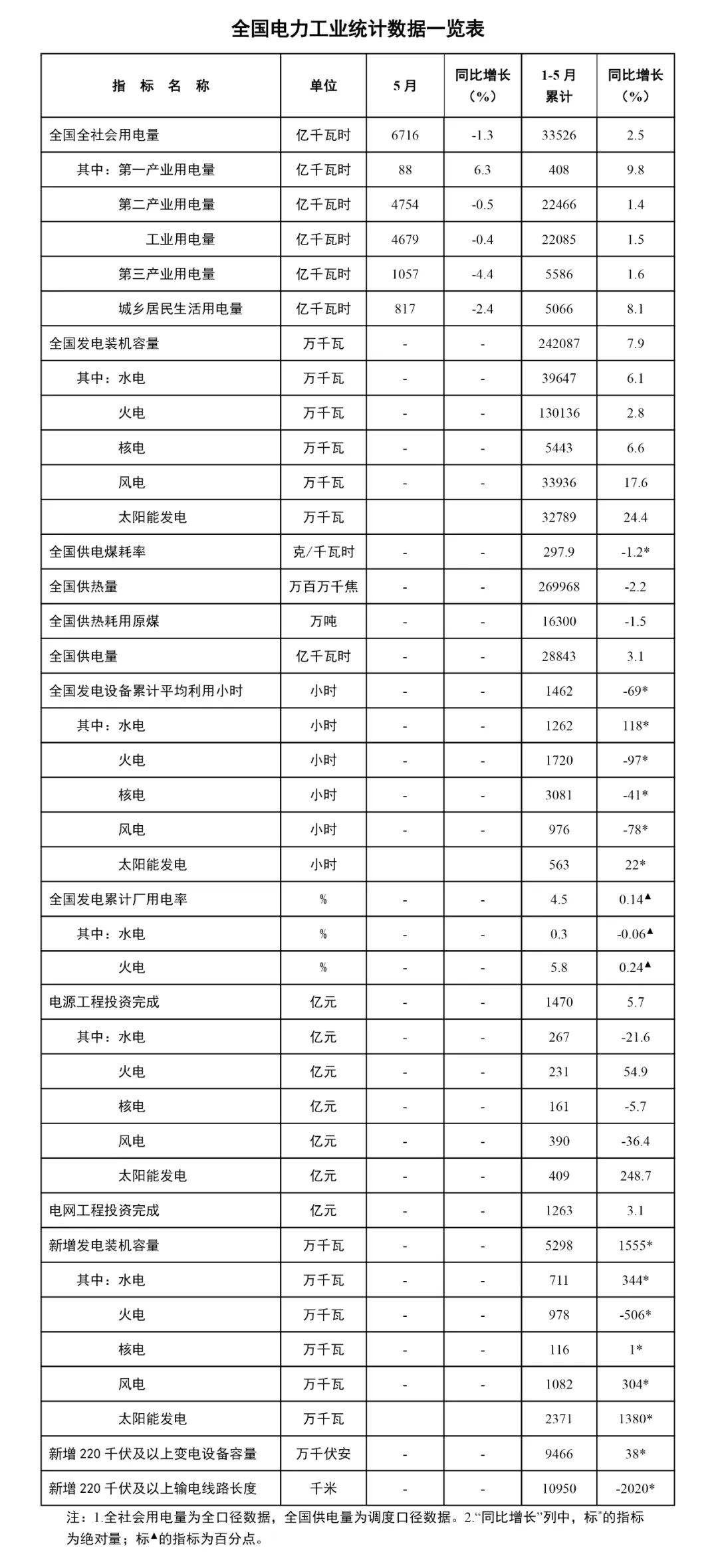 6月16日,国家能源局发布1-5月份全国电力工业统计数据。截至5月底,全国发电装机容量约24.2亿千瓦,同比增长7.9%。1-5月份,全国发电设备累计平均利用1462小时,比上年同期减少69小时。