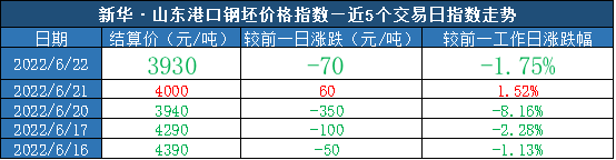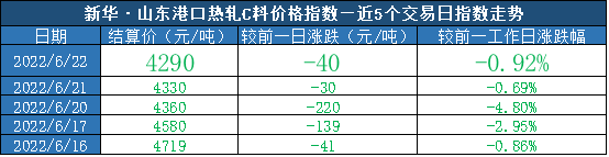 新华财经·指数|山东港口大商中心钢坯、热轧C料价格指数日报(6月22日)