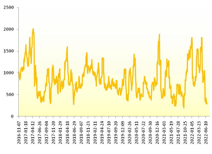 其中广西、海南、云南、福建、广东产区指数分别报138.33点、118.56点、41.86点、142.86点、103.13点。本期(2022.6.20-6.24),海南产区统货均价约为1.63元/斤,较前一期(2022.6.13-6.17)下跌0.15元/斤,跌幅8.52%;广东产区统货均价约为1.13元/斤,较前一期(2022.6.13-6.17)下跌0.07元/斤,跌幅5.56%。