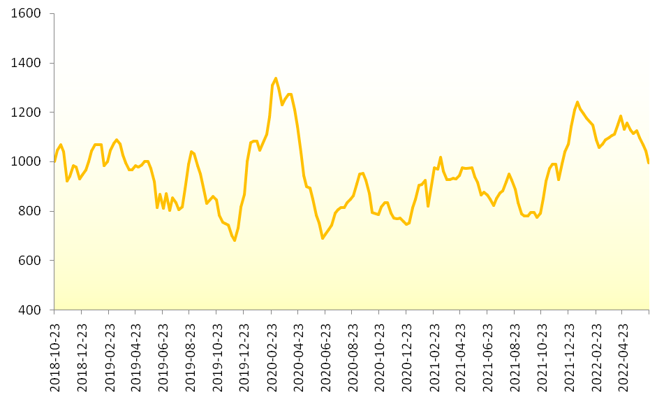 2022年6月22日,新华-进口香蕉价格指数报996.01点,较6月15日下跌46.55点,跌幅4.46%;较基期下跌3.99点,跌幅0.40%。