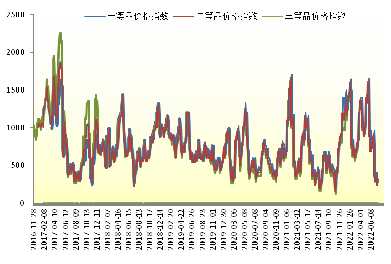 2022年6月24日,海南省皇帝蕉一等品价格指数报281.09点,较6月17日下跌80.31点,跌幅22.22%;较基期下跌718.91点,跌幅71.89%。二等品价格指数报240.94点,较6月17日下跌80.31点,跌幅25.00%;较基期下跌759.06点,跌幅75.91%;三等品价格指数报200.78点,较6月17日下跌80.31点,跌幅28.57%;较基期下跌799.22点,跌幅79.92%。