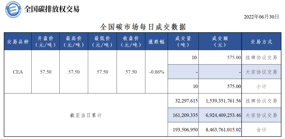 6月30日全国碳市场碳排放配额(CEA)挂牌协议交易成交量10吨,成交额575.00元,收盘价57.50元/吨,收盘价较前一日下跌0.86%。今日无大宗协议交易。