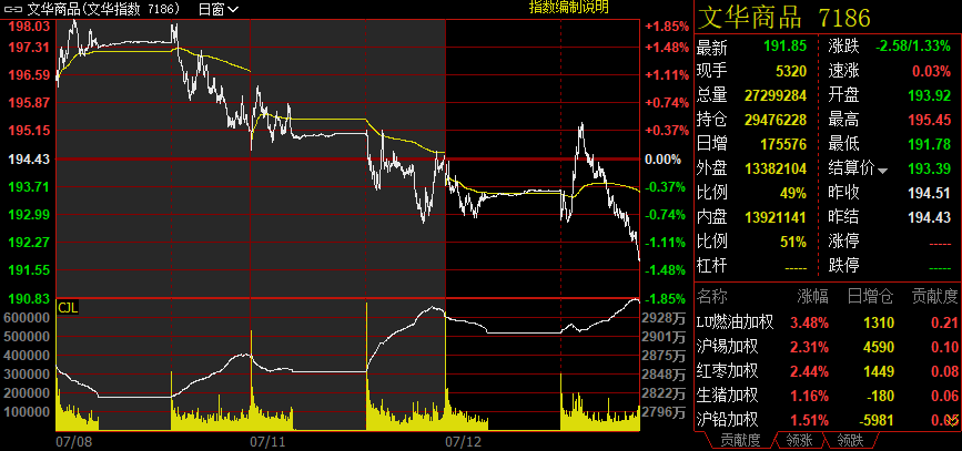 新华财经北京7月12日电(郭洲洋、左元)7月12日国内商品市场跌多涨少,截至下午收盘,追踪国内商品市场的综合指数收报191.85点,较上一交易日下跌2.58点,跌幅1.33%。下跌品种中,焦炭、甲醇主力合约跌超5%;铁矿石、PTA、乙二醇(EG)、热卷、螺纹钢、焦煤主力合约跌超4%;短纤、PVC、沪铝、棉花、苯乙烯、锰硅、纯碱主力合约跌超3%。上涨品种方面,低硫燃油(LU)主力合约涨超3%;沪锡主力合约涨超2%;沪铅、生猪主力合约涨超1%。