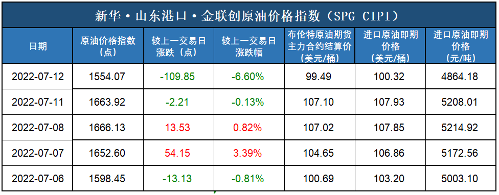 新华财经北京7月13日电(杨猛) 截至2022年7月12日,新华·山东港口·金联创原油价格指数(SPG CIPI)报1554.07点,较前一交易日下跌109.85点,跌幅6.60%;进口原油即期价格为100.32美元/桶,合人民币4864.18元/吨。山东港口进口原油综合到岸贴水估价为4.88美元/桶,较前一交易日下跌0.12美元/桶,跌幅2.40%。