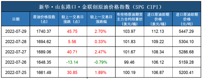 新华财经北京8月1日电(杨猛) 截至2022年7月29日,新华·山东港口·金联创原油价格指数(SPG CIPI)报1740.37点,较前一交易日上涨45.75点,涨幅2.70%;进口原油即期价格为112.13美元/桶,合人民币5447.29元/吨。山东港口进口原油综合到岸贴水估价为7.20美元/桶,较前一交易日持平。