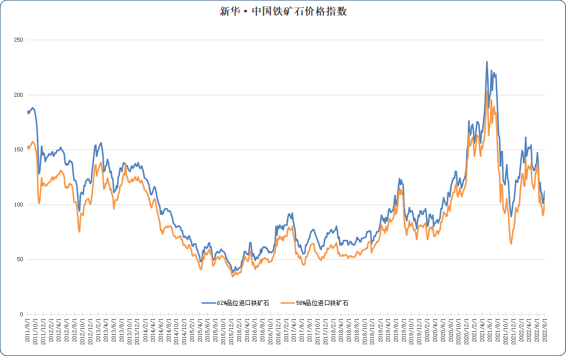 新华·中国铁矿石价格指数显示,7月26日至8月1日间,进口铁矿石价格偏强运行。数据显示,8月1日,我国62%品位进口铁矿石价格指数为112。