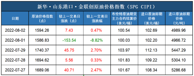 新华财经北京8月3日电(杨猛) 截至2022年8月2日,新华·山东港口·金联创原油价格指数(SPG CIPI)报1594.26点,较前一交易日上涨7.43点,涨幅0.47%;进口原油即期价格为102.69美元/桶,合人民币4989.96元/吨。山东港口进口原油综合到岸贴水估价为6.80美元/桶,较前一交易日下跌0.08美元/桶,跌幅1.16%。