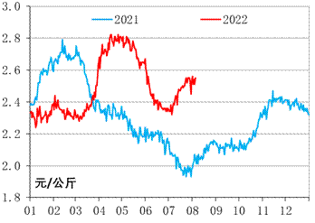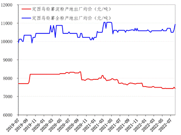 国内消费整体低迷的背景下,初级薯制品加工企业开工率不高。整体上来看,国内马铃薯淀粉生产相对充足且生产主体多元化,而马铃薯全粉生产则相对不足。新产季价格预期方面,国内加工薯出货价格亦是高企,马铃薯全粉出厂价格将持续上行,马铃薯淀粉价格或将震荡上行。截至2022年8月5日,定西马铃薯淀粉出厂价格报7443.48元/吨,环比下跌0.93%,同比下跌3.06%;定西马铃薯全粉出厂价格报10935.00元/吨,环比上涨2.86%,同比上涨3.08%。