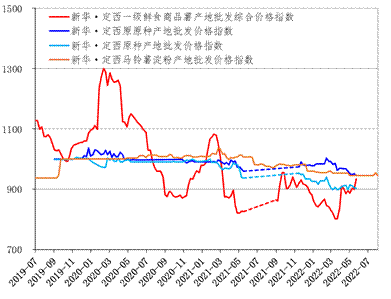备注:样本发生变化时进行指数修正,通常为年度间调整。对应地,产地均价不做修正以便反映确切产地价格水平。截至2022年5月27日,2021/2022年度定西商品薯销售结束,定西种薯完全进入销售淡季。因此,自2022年6月3日起仅更新新华·定西马铃薯淀粉产地批发价格指数,其余指数待新产季开始后恢复更新。