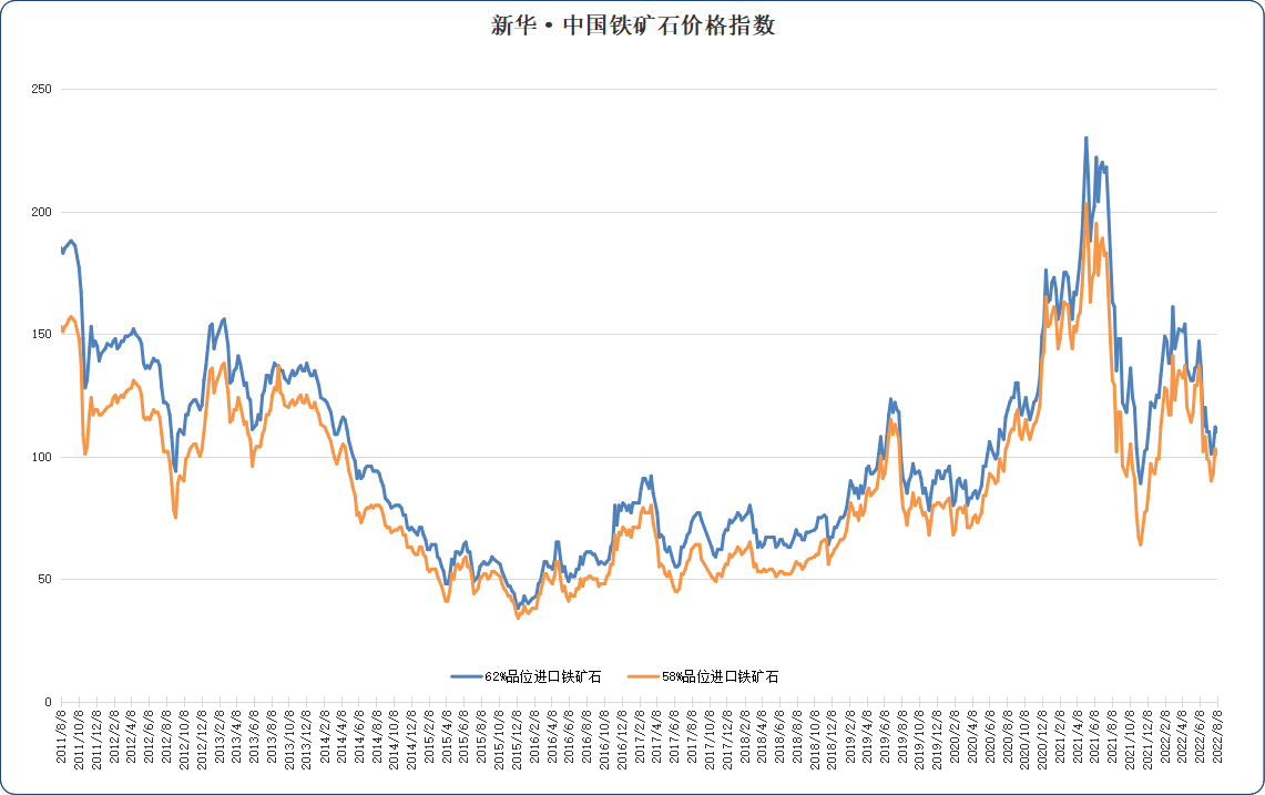 新华·中国铁矿石价格指数显示,8月2日至8月8日间,进口铁矿石价格承压运行。