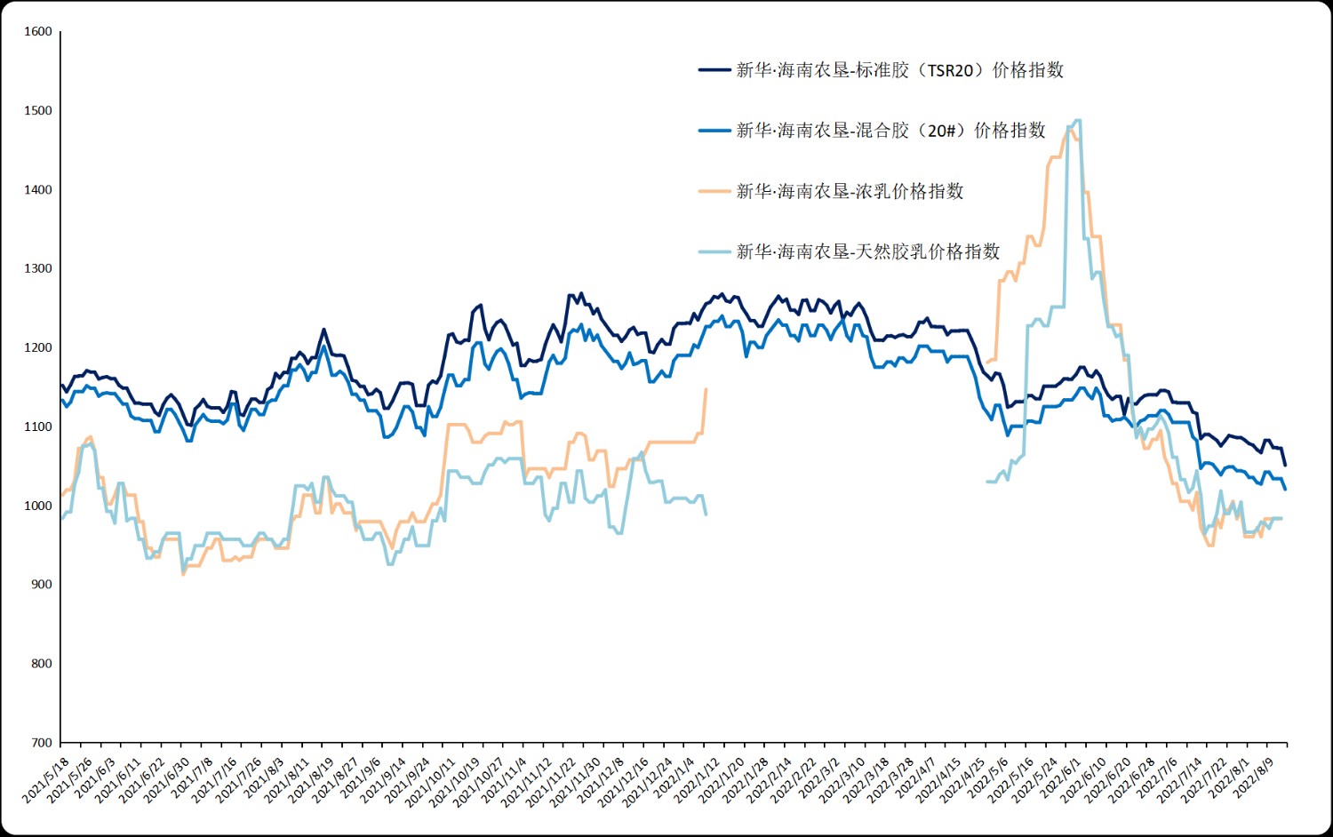 8月15日,标准胶(TSR20)价格指数报1050.61点,较(8月8日,下同)跌2.91%;混合胶(20#)价格指数报1020.18点,跌2.08%;海南产区各采集点暂停割胶,浓乳和天然胶乳价格指数暂停更新。