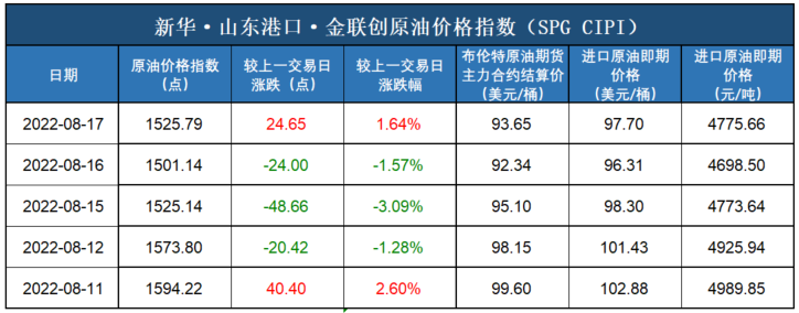 新华财经北京8月18日电(杨猛) 截至2022年8月17日,新华·山东港口·金联创原油价格指数(SPG CIPI)报1525.79点,较前一交易日上涨24.65点,涨幅1.64%;进口原油即期价格为97.70美元/桶,合人民币4775.66元/吨。山东港口进口原油综合到岸贴水估价为3.45美元/桶,较前一交易日持平。