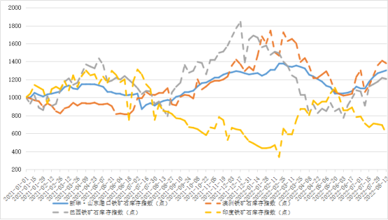 截至2022年8月12日,新华·山东港口铁矿石库存指数报1301.01点,较8月5日上涨15.99点,涨幅1.24%。