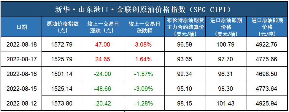 新华财经北京8月19日电(杨猛) 截至2022年8月18日,新华·山东港口·金联创原油价格指数(SPG CIPI)报1572.79点,较前一交易日上涨47.00点,涨幅3.08%;进口原油即期价格为100.79美元/桶,合人民币4922.76元/吨。山东港口进口原油综合到岸贴水估价为3.53美元/桶,较前一交易日上涨0.08美元/桶,涨幅2.32%。