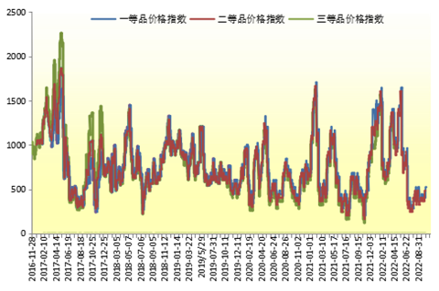2022年9月16日,海南省皇帝蕉一等品价格指数报522.03点,较9月9日上涨120.47点,涨幅30.00%;较基期下跌477.97点,跌幅47.80%。海南省皇帝蕉二等品价格指数报481.88点,较9月9日上涨120.47点,涨幅33.33%;较基期下跌518.12点,跌幅51.81%;三等品价格指数报441.72点,较9月9日上涨120.47点,涨幅37.50%;较基期下跌558.28点,跌幅55.83%。