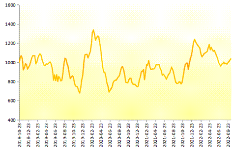 2022年9月14日,新华-进口香蕉价格指数报1040.61点,较9月7日上涨16.52点,涨幅1.61%;较基期上涨40.61点,涨幅4.06%。