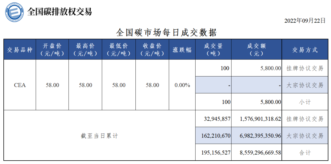 9月22日全国碳市场碳排放配额(CEA)挂牌协议交易成交量100吨,成交额5,800.00元,收盘价58.00元/吨,收盘价与前一日持平。今日无大宗协议交易。
