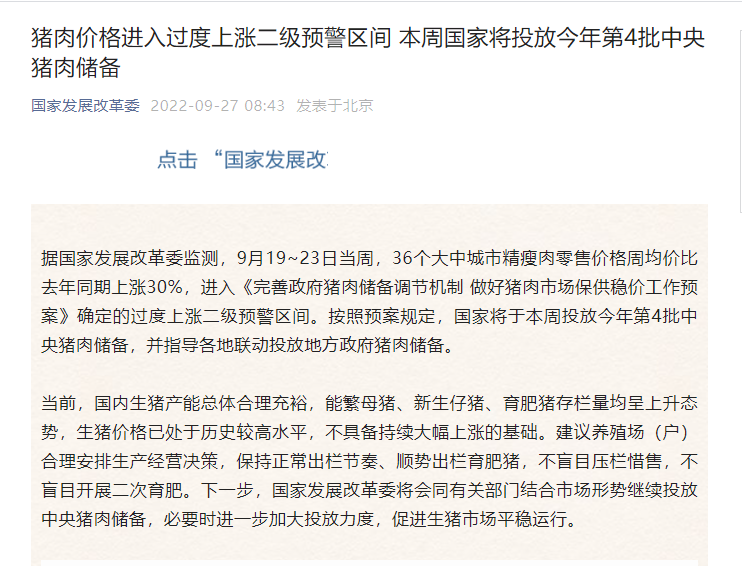 新华财经北京9月27日电 据国家发展改革委监测,9月19~23日当周,36个大中城市精瘦肉零售价格周均价比去年同期上涨30%,进入《完善政府猪肉储备调节机制 做好猪肉市场保供稳价工作预案》确定的过度上涨二级预警区间。按照预案规定,国家将于本周投放今年第4批中央猪肉储备,并指导各地联动投放地方政府猪肉储备。