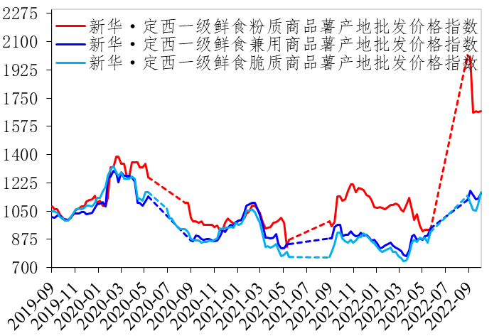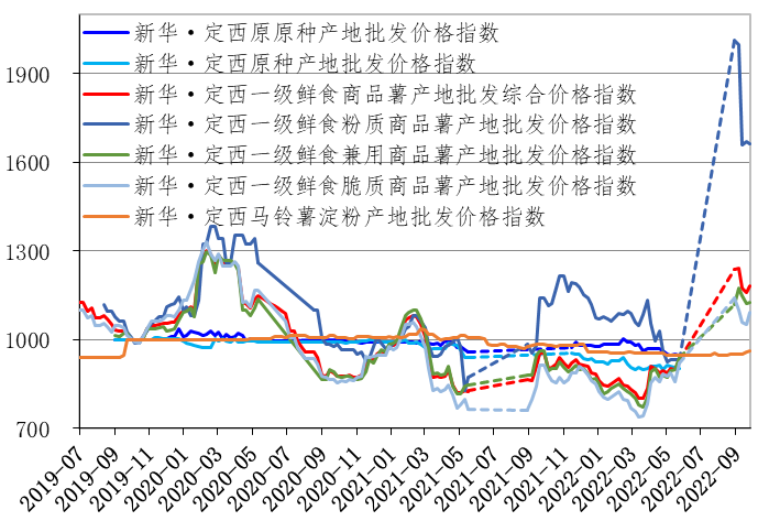 新产季定西商品薯产地批发价格高企,定西乃至全国初级薯制品出厂价格持续走强。目前,国内商品薯及其上下游产品看涨情绪强烈,十月份定西种薯产地批发价格指数有望重启运行并处于相对高位。