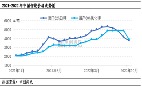 10月,全球钾肥市场陷入供强需弱状态,价格持续震荡下行。本月中国边贸口岸钾肥供应合同价480-490美元/吨,根据往年海运合同价比边贸口岸价格低10-30美元/吨推算,初步预计2023年中国钾肥大合同价格不高于450美元/吨。另悉,有消息称,印度新签钾肥大合同意向价为380美元/吨(到岸价),较年初价格下跌210美元/吨,跌幅达到35.6%。虽消息未证实,但可以反映出业内商家对后期钾肥价格走势预判悲观。受此影响,国际、国内钾肥供货商“去库存”意识仍将不断增强,或为后期价格下跌埋下伏笔。